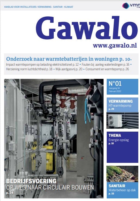 In deze editie o.a. Onderzoek naar warmtebatterijen in woningen, Impact warmtepompen op belasting elektriciteitsnet, Fouten bij aanleg waterleidingen, Herziening norm luchtdichtheid, Wijk aardgasvrij, Consument en warmtepomp, Op weg naar circulair bouwen, HT-warmtepomp, Energie-opslag, Waterbeheer op dak.