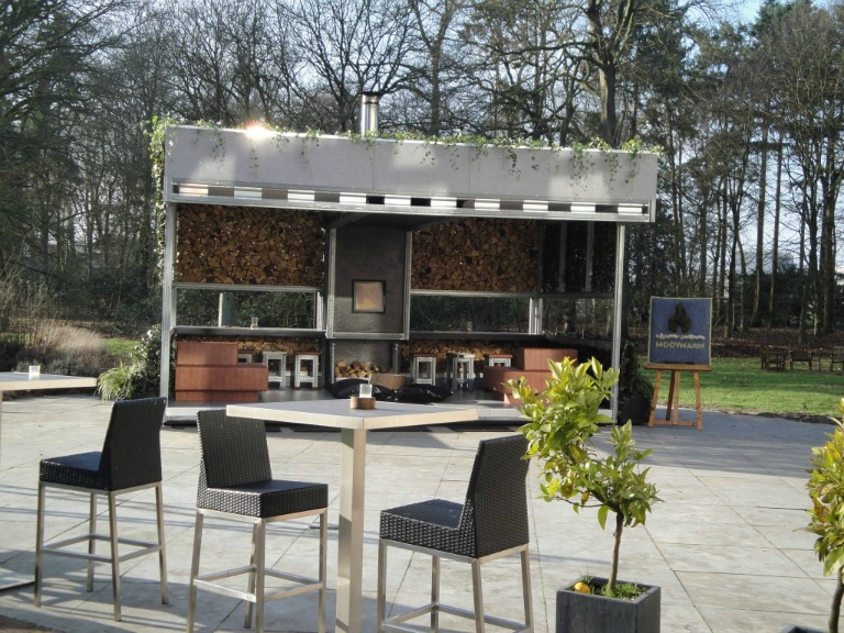 Mooywarm is een terrasmodule die wordt verwarmd met een cv-houtkachel en zonnepanelen. Bezoekers van het Cultuur- en Congrescentrum Antropia in Driebergen kunnen het terras nu uittesten.