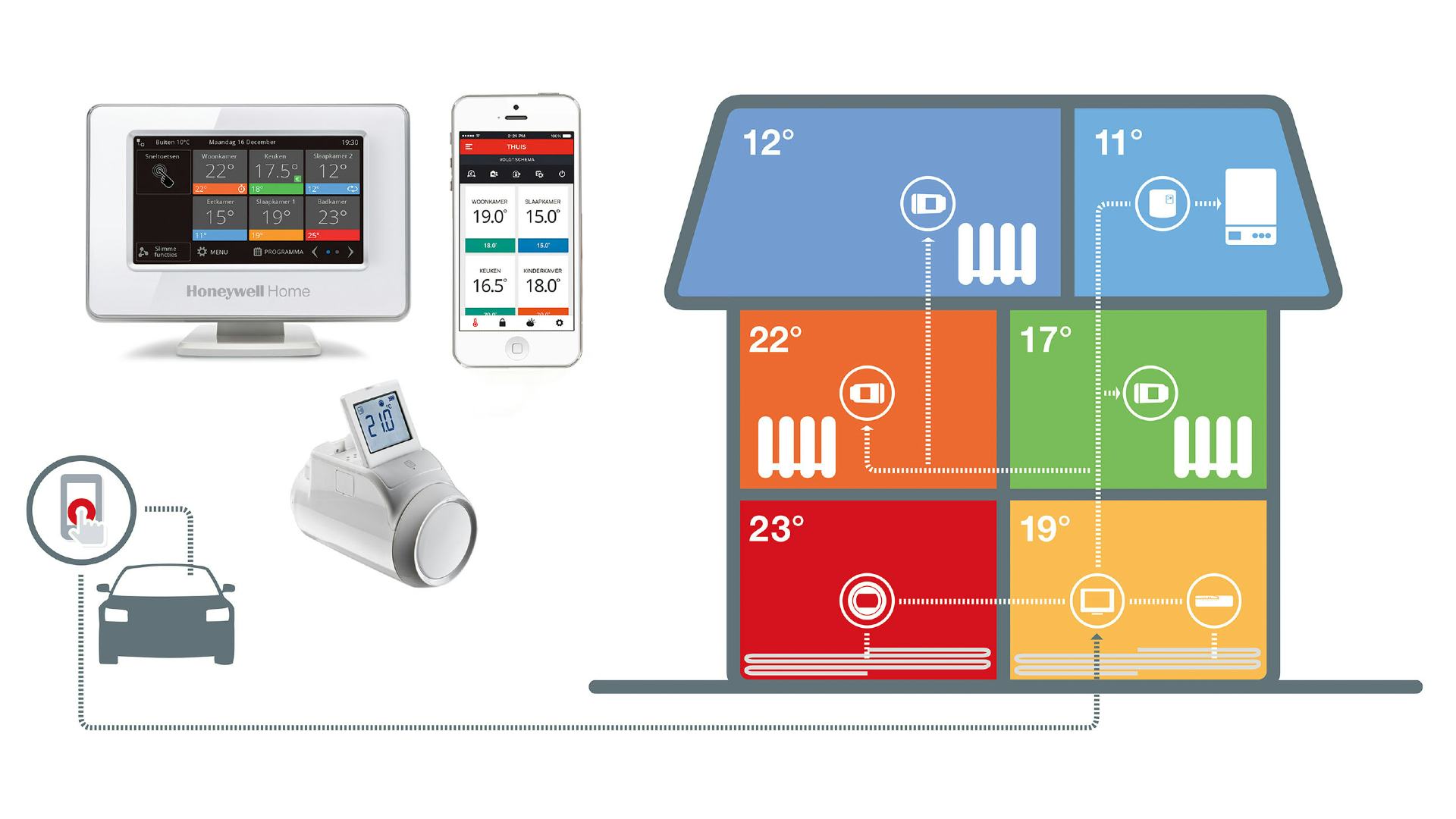 Hoe kies ik voor mijn klant de juiste temperatuurregeling? Het allerbelangrijkste uitgangspunt bij het kiezen van het juiste type temperatuurregeling zijn de levensstijl en de behoeften van je klant. Wil deze bewoner de temperatuur lokaal, centraal of op afstand regelen? Als je het antwoord op die vraag hebt, kan je al veel gerichter adviseren. Laten we alle mogelijkheden eens onder de loep nemen.