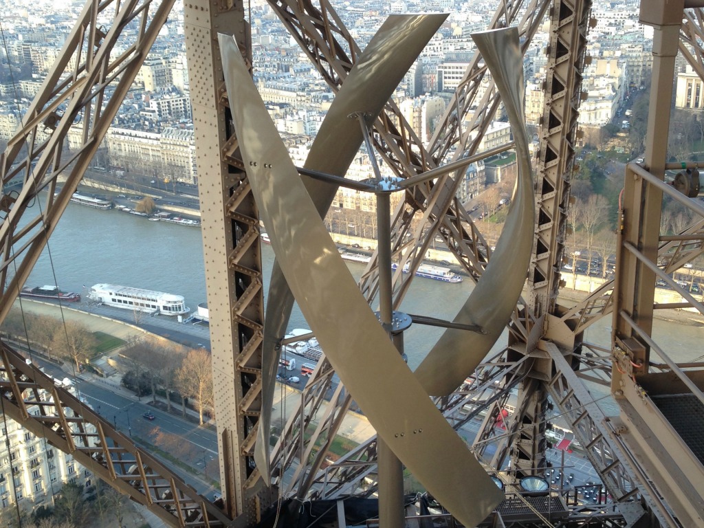 In de Eiffeltoren zijn vorige week twee windturbines met verticale as gemonteerd, van ruim 5 m hoog en 3 m in doorsnede. Daarnaast is 10 m2 aan zonnecollectoren geïnstalleerd.